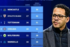 2026年各项赛事丢球榜:纽卡36球最多,切尔西20场31球第四