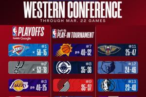 2.西部第五的掘金、第六的森林狼以及第七的太阳今日相继赢球,其中掘金与森林狼的战绩继续持平(同为44胜28负,掘金因交手战绩占优排名靠前)。