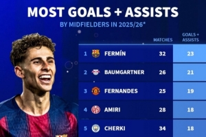 本赛季中场参与进球榜:费尔明32场造23球 B费、谢尔基、索博在列