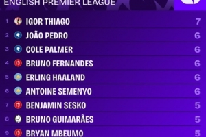 进入2026年,伊戈尔·蒂亚戈在英超中已直接参与7球,位居所有球员之首。位居他身后的是若昂·佩德罗、帕尔默、B费、哈兰德以及塞梅尼奥的6球,舍什科、吉马良斯、姆伯莫和约克雷斯的参与进球数则为5球。
